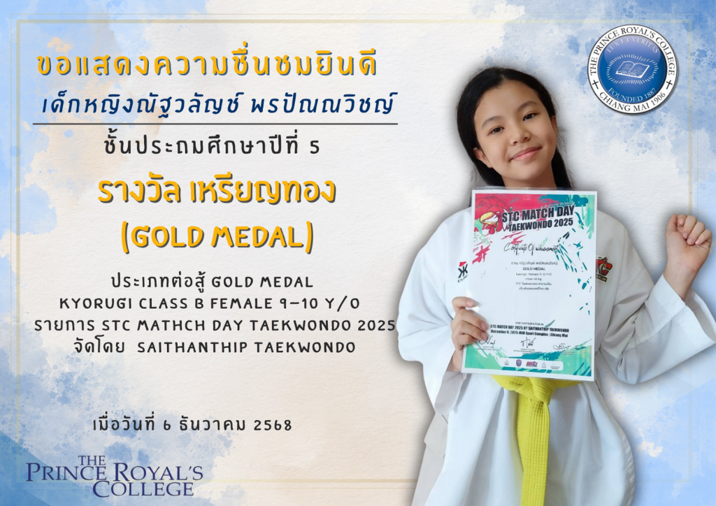 เด็กหญิงณัฐวลัญช์ พรปัณณวิชญ์ รางวัลชนะเลิศ เหรียญทอง ประเภทต่อสู้ Gold Medal Kyorugi Class B Female 9-10 Y/O รายการ STC MATHCH DAY TAEKWONDO 2025