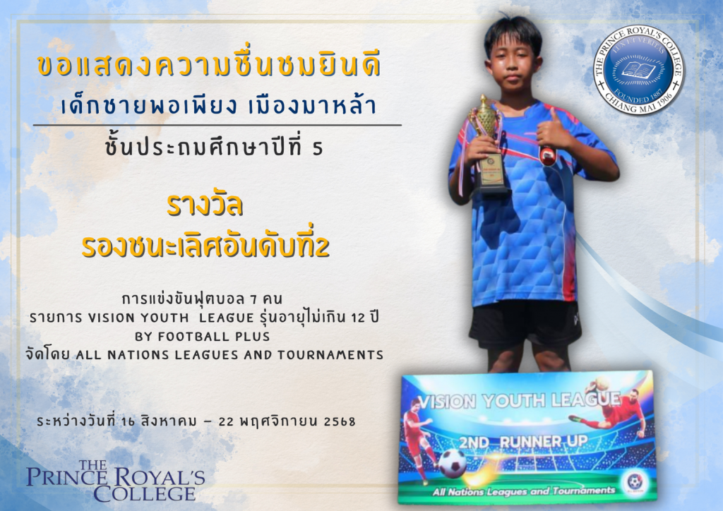 เด็กชายพอเพียง เมืองมาหล้า รางวัลรองชนะเลิศอันดับที่2 การแข่งขันฟุตบอล 7 คน รายการ VISION YOUTH LEAGUE