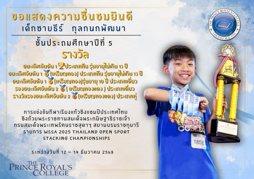 เด็กชาย ธีร์ กุลกนกพัฒนา รางวัลการแข่งขันกีฬาสแต็คชิงแชมป์ประเทศไทย รายการ WSSA 2025 Thailand Open Sport Stacking Championships
