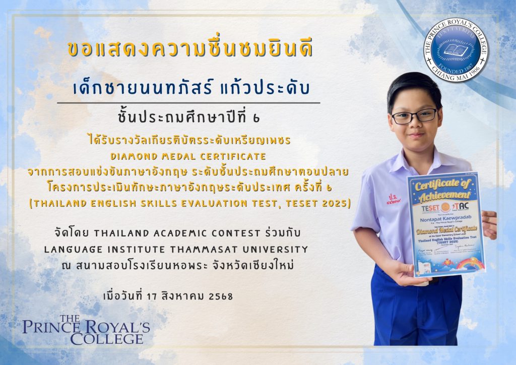 เด็กชายนนทภัสร์ แก้วประดับ รางวัลเกียรติบัตรระดับเหรียญเพชร DIAMOND MEDAL CERTIFICATE จากการสอบแข่งขันภาษาอังกฤษ ระดับชั้นประถมศึกษาตอนปลาย โครงการประเมินทักษะภาษาอังกฤษระดับประเทศ ครั้งที่ 6