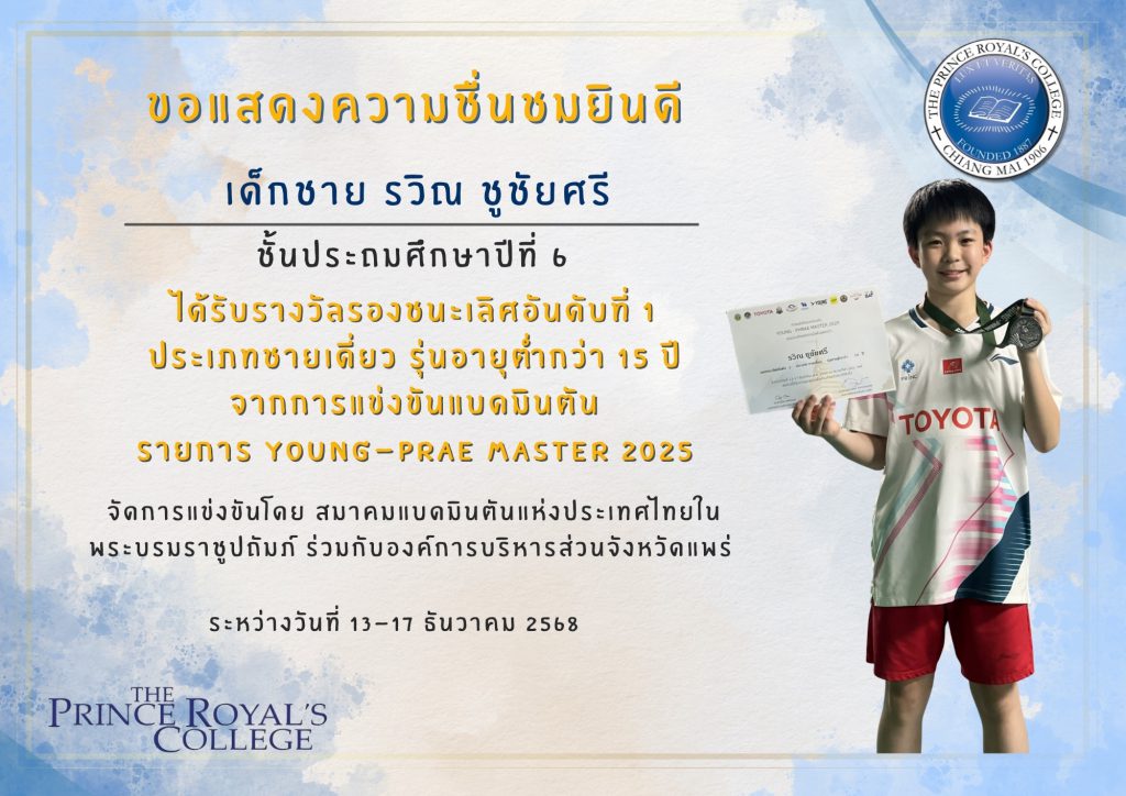 เด็กชายรวิณ ชูชัยศรี รางวัลรองชนะเลิศอันดับที่ 1 ประเภทชายเดี่ยว รุ่นอายุต่ำกว่า 15 ปี จากการแข่งขันแบดมินตันรายการ Young-Prae Master 2025