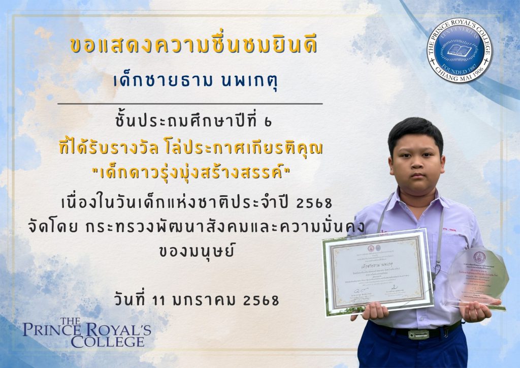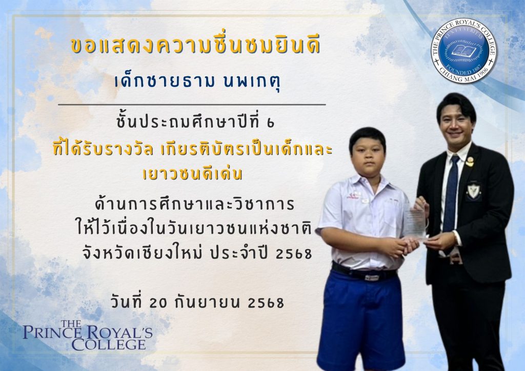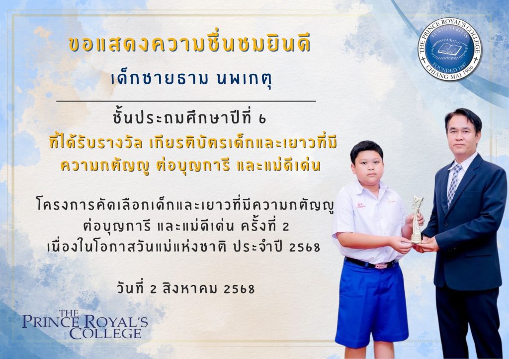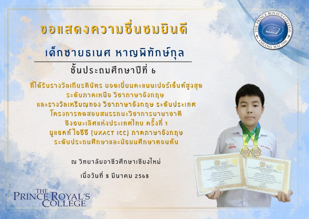 เด็กชายธเนศ หาญพิทักษ์กุล รางวัลเกียรติบัตร ยอดเยี่ยมคะแนนเปอร์เซ็นต์สูงสุดระดับภาคเหนือ วิชาภาษาอังกฤษ และรางวัลเหรียญทอง วิชาภาษาอังกฤษ ระดับประเทศ โครงการทดสอบสมรรถนะวิชาการนานาชาติ ชิงชนะเลิศแห่งประเทศไทย ครั้งที่ 1