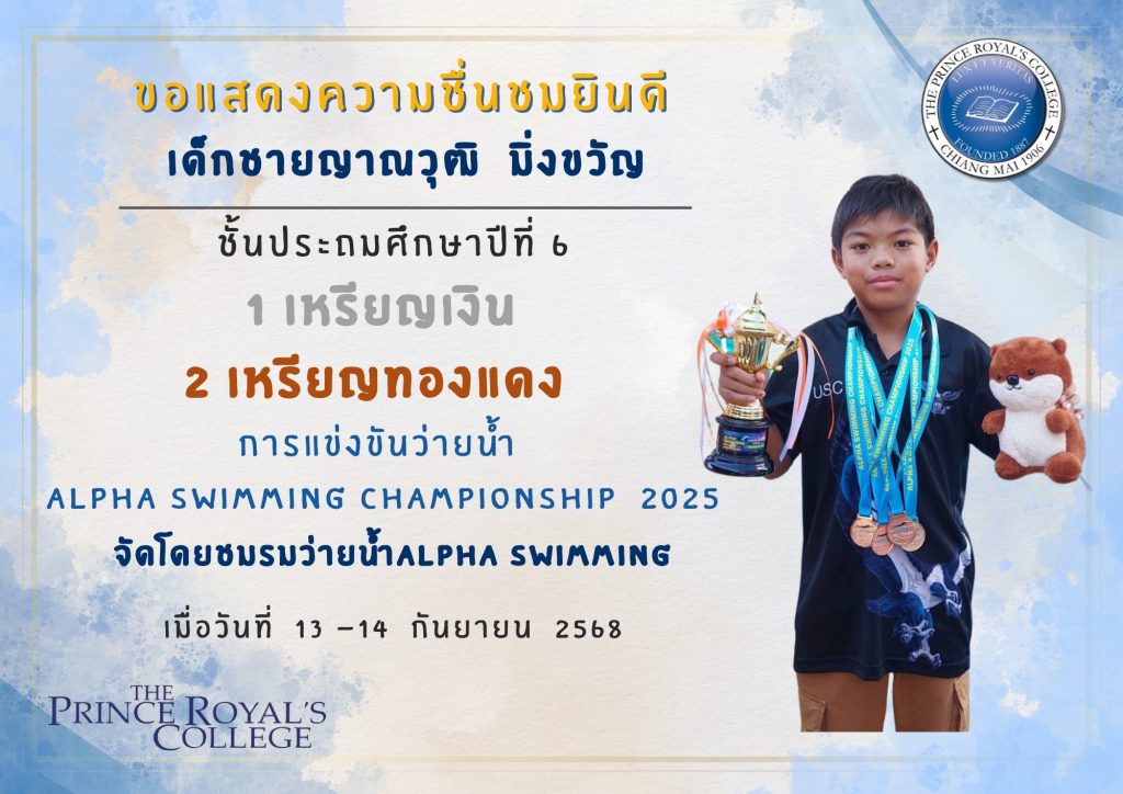 เด็กชายญาณวุฒิ มิ่งขวัญ 1 เหรียญเงิน และ 3 เหรียญทองแดง การแข่งขันว่ายน้ำ Alpha Swimming Championship 2025