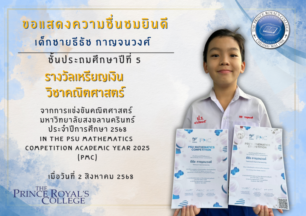 เด็กชายธีธัช กาญจนวงศ์ รางวัลเหรียญเงินวิชาคณิตศาสตร์ จากการแข่งขันคณิตศาสตร์ มหาวิทยาลัยสงขลานครินทร์ ประจำปีการศึกษา 2568 in the PSU Mathematics Competition Academic Year 2025(PMC)