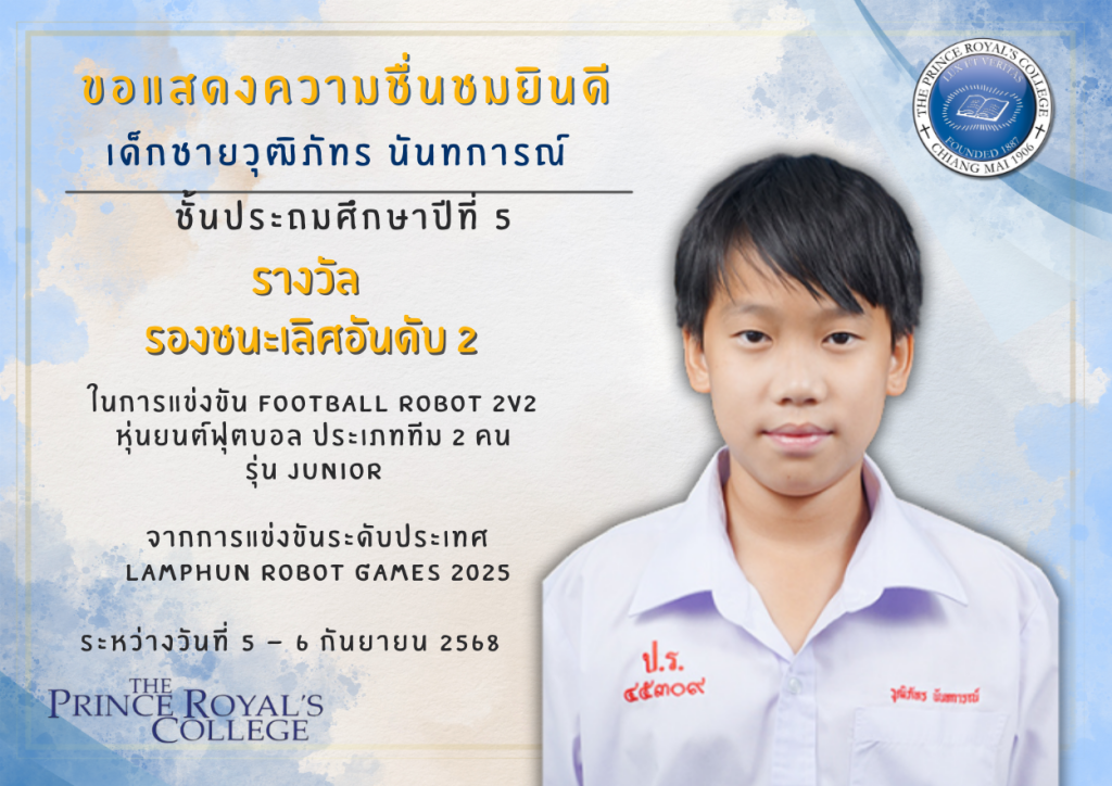 ขอแสดงความยินดีกับเด็กชายวุฒิภัทร นันทการณ์ รางวัลรองชนะเลิศอันดับ 2 ในการแข่งขัน Football Robot 2v2 หุ่นยนต์ฟุตบอล ประเภททีม 2 คน รุ่น Junior จากการแข่งขันระดับประเทศ Lamphun Robot Games 2025