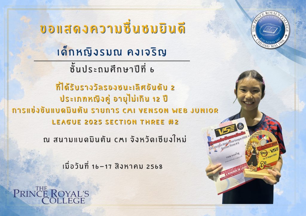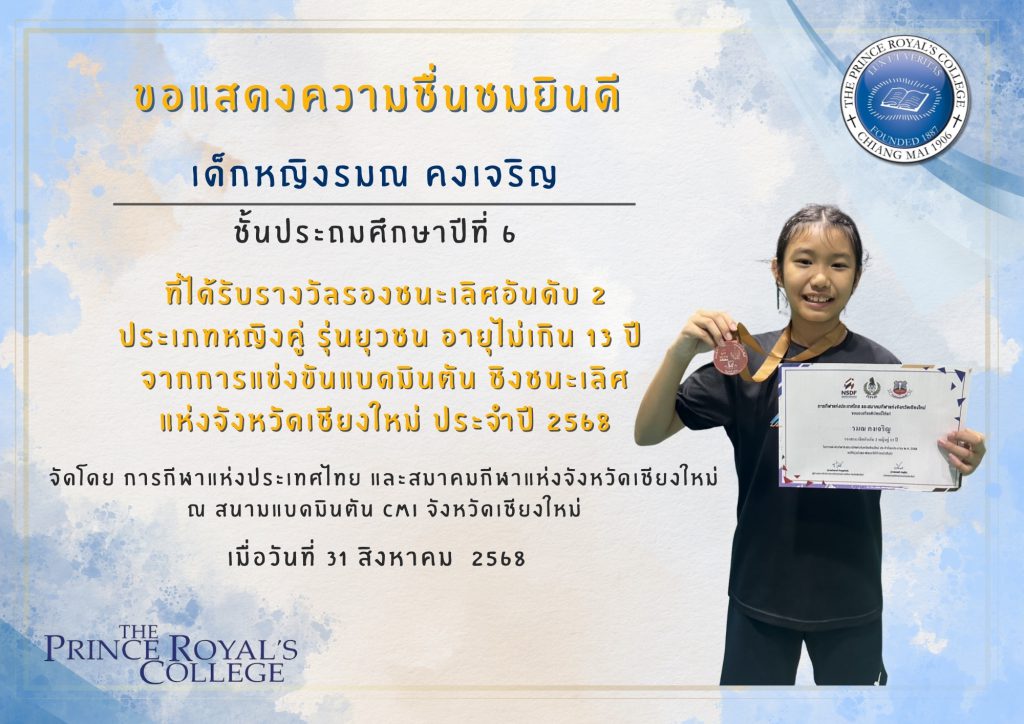 เด็กหญิงรมณ คงเจริญ รางวัลรองชนะเลิศอันดับ 2 ประเภทหญิงคู่ รุ่นยุวชน อายุไม่เกิน 13 ปี จากการแข่งขันแบดมินตัน ชิงชนะเลิศ แห่งจังหวัดเชียงใหม่ ประจำปี 2568
