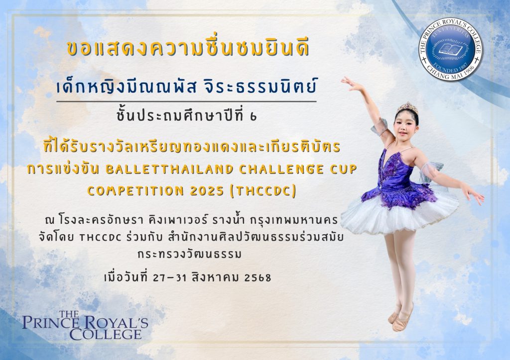เด็กหญิงมีณณพัส จิระธรรมนิตย์ รางวัลเหรียญทองแดงและเกียรติบัตร การแข่งขัน BALLET Thailand Challenge Cup Competition 2025 (THCCDC)