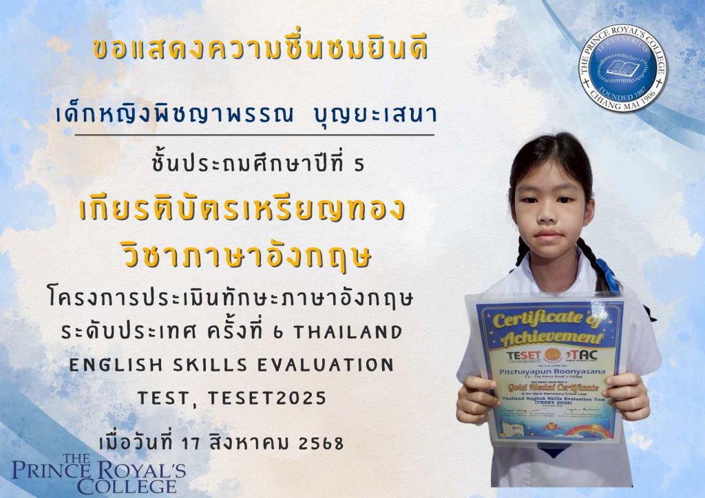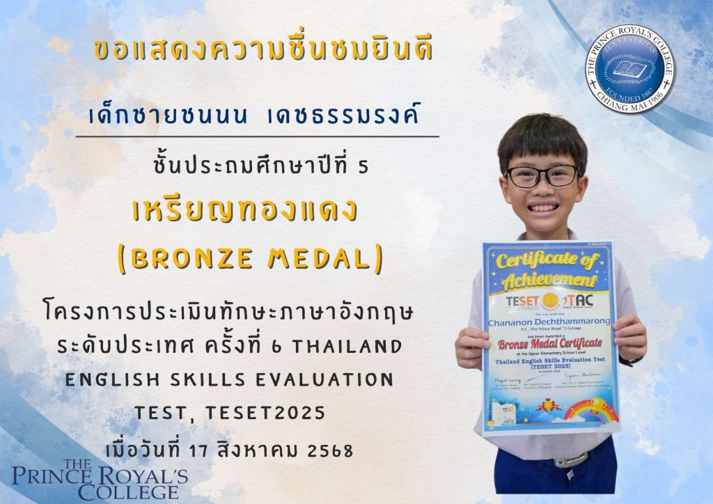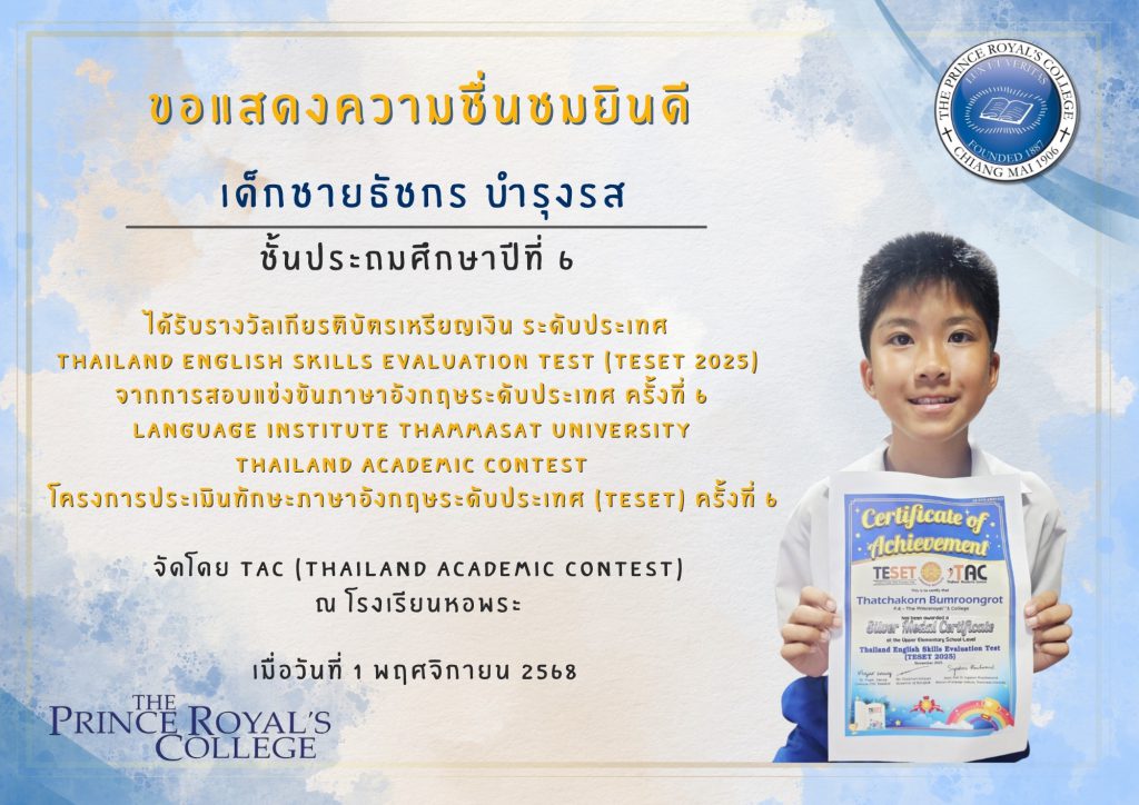 เด็กชายธัชกร บำรุงรส รางวัลเกียรติบัตรเหรียญเงิน ระดับประเทศ Thailand English Skills Evaluation Test (TESET 2025) จากการสอบแข่งขันภาษาอังกฤษระดับประเทศ ครั้งที่ 6