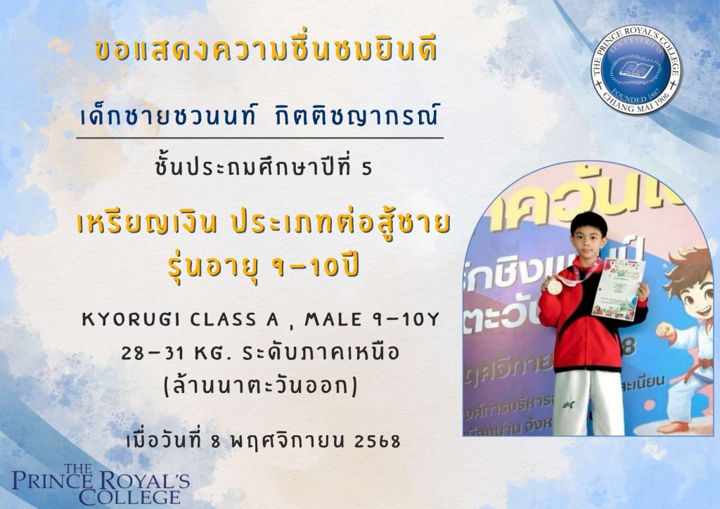 เด็กชายชวนนท์ กิตติชญากรณ์ ได้รับรางวัลเหรียญเงิน ประเภทต่อสู้ ชายรุ่นอายุ 9-10ปี