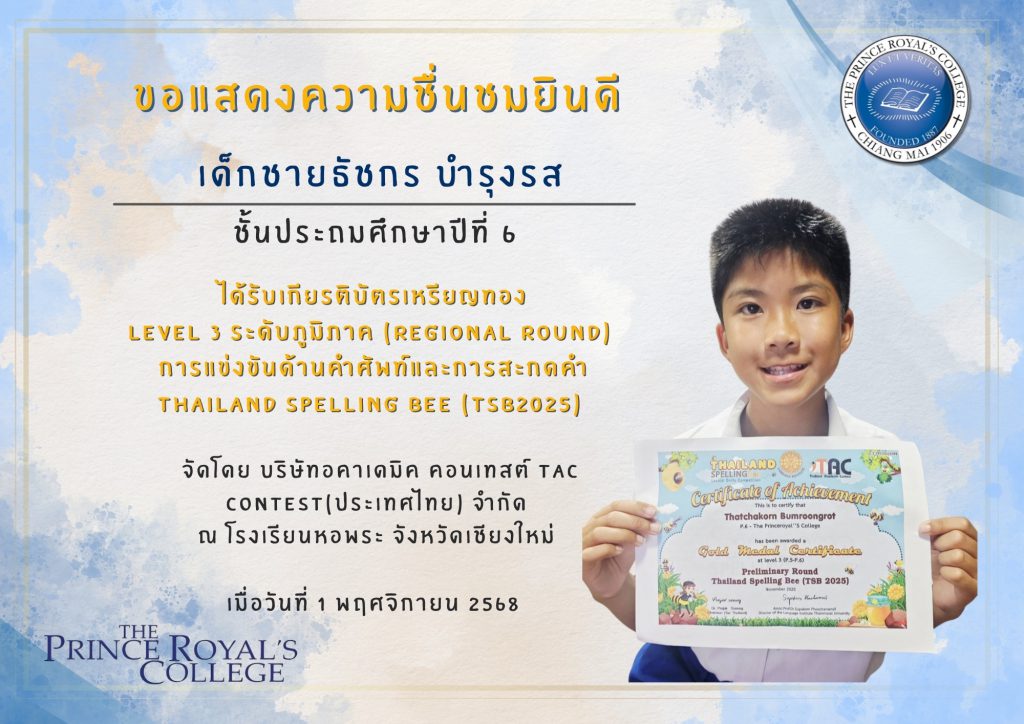 เด็กชายธัชกร บำรุงรส เกียรติบัตรเหรียญทอง Level 3 ระดับภูมิภาค (regional round) การแข่งขันด้านคำศัพท์และการสะกดคำ Thailand Spelling Bee (TSB2025)