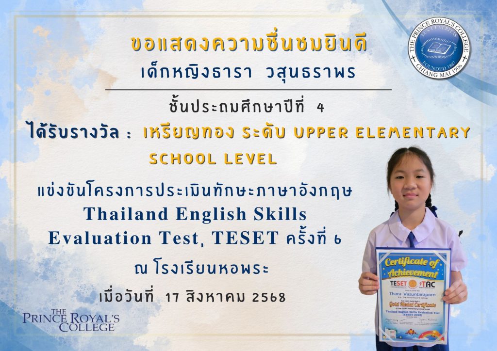 เด็กหญิง ธารา วสุนธราพร : เหรียญทอง ากการสอบแข่งขันโครงการประเมินทักษะภาษาอังกฤษ