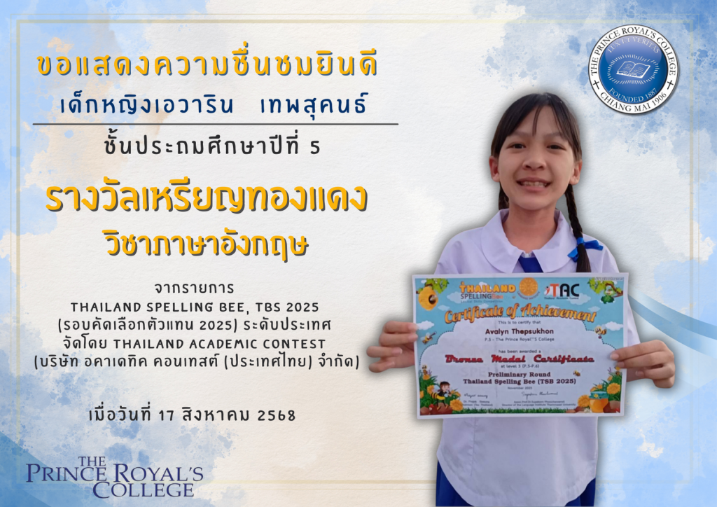เด็กหญิงเอวาริน เทพสุคนธ์ รางวัลเหรียญทองแดง วิชาภาษาอังกฤษ จากรายการ Thailand Spelling Bee, TBS 2025 (รอบคัดเลือกตัวแทน 2025) ระดับประเทศ