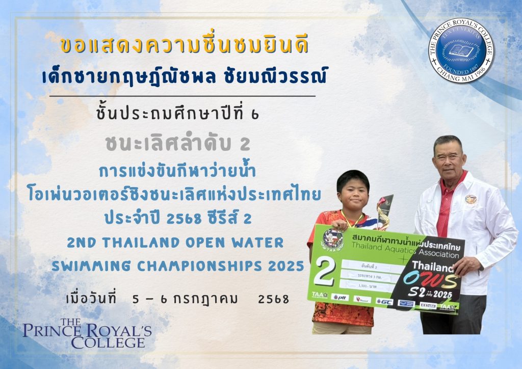 เด็กชายกฤษฎ์ณัชพล ชัยมณีวรรณ์ รางวัลชนะเลิศลำดับ 2 จากรายการแข่งขันว่ายน้ำโอเพ่นวอเตอร์ รุ่นอายุไม่เกิน 11ปีชาย
