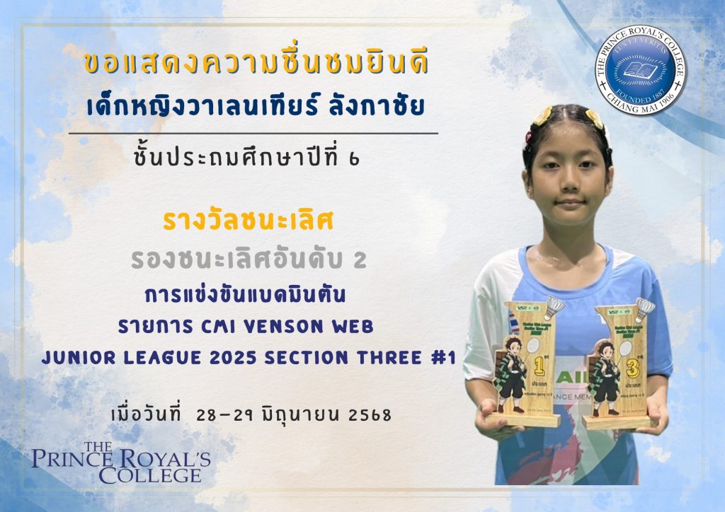 เด็กหญิงวาเลนเทียร์ ลังกาชัย รางวัลชนะเลิศ รองชนะเลิศอันดับ 2 การแข่งขันแบดมินตัน รายการ CMI VENSON Web