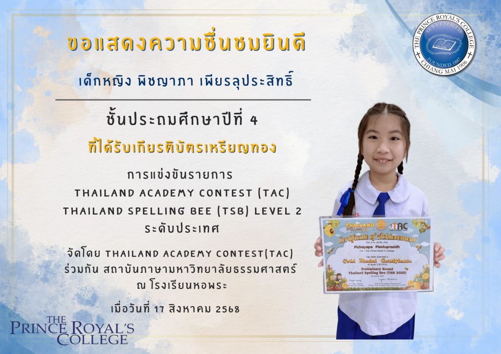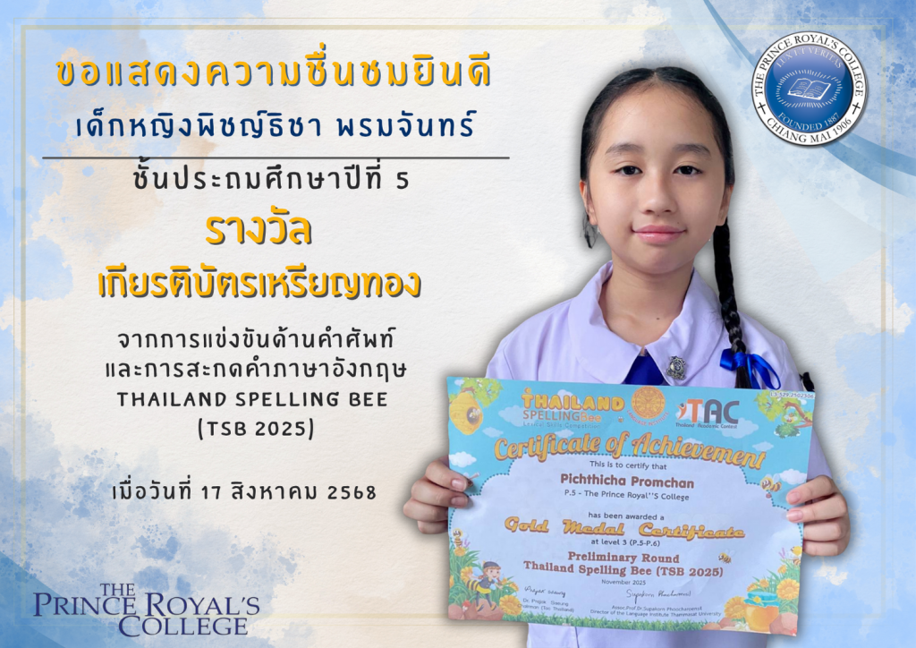เด็กหญิงพิชญ์ธิชา พรมจันทร์ นักเรียนชั้นประถมศึกษาปีที่ 5 เกียรติบัตรเหรียญทอง จากการแข่งขันด้านคำศัพท์และการสะกดคำภาษาอังกฤษ Thailand Spelling Bee (TSB 2025)