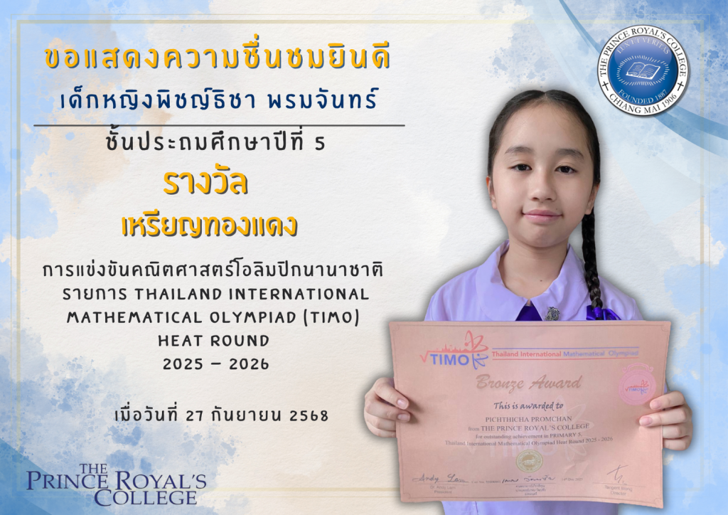 เด็กหญิงพิชญ์ธิชา พรมจันทร์ นักเรียนชั้นประถมศึกษาปีที่ 5 รางวัลเหรียญทองแดง การแข่งขันโครงการคณิตศาสตร์โอลิมปิกนานาชาติ รายการ Thailand International Mathematical Olympiad (TIMO) Heat Round 2025 – 2026
