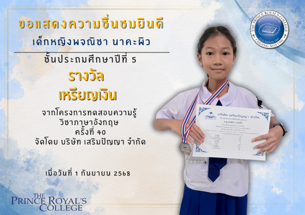 เด็กหญิงพจณิชา นาคะผิว นักเรียนระดับชั้นประถมศึกษาปีที่ 5 รางวัลเหรียญเงิน จากโครงการทดสอบความรู้ วิชาภาษาอังกฤษ ครั้งที่ 40