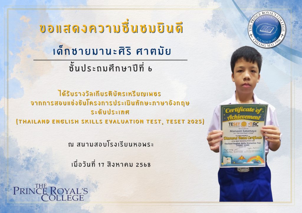 เด็กชายมานะศิริ ศาตมัย รางวัลเกียรติบัตรเหรียญเพชร จากการสอบแข่งขันโครงการประเมินทักษะภาษาอังกฤษระดับประเทศ