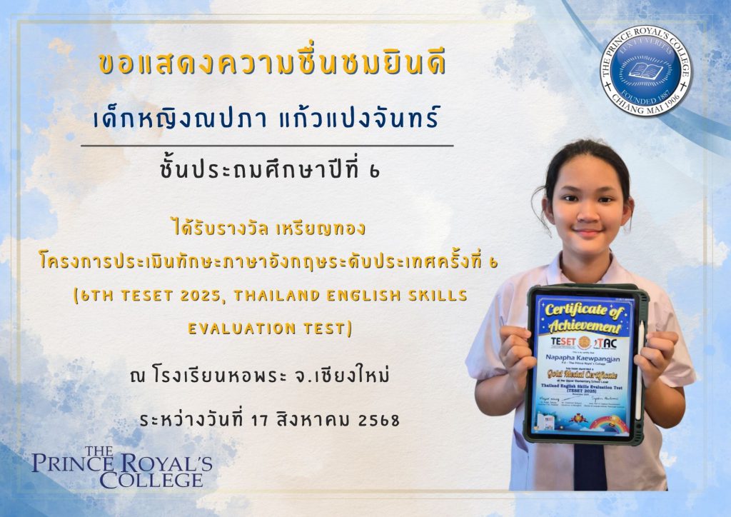 เด็กหญิงพิชญ์ธิชา พรมจันทร์ นักเรียนชั้นประถมศึกษาปีที่5 เกียรติบัตรเหรียญทอง จากโครงการประเมินทักษะภาษาอังกฤษระดับประเทศ Thailand English Skills Evaluation Test (TESET 2025)