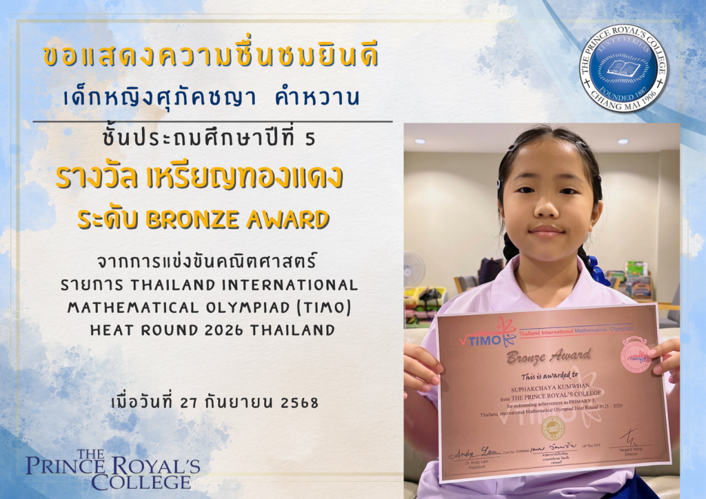เด็กหญิงศุภัคชญา คำหวาน นักเรียนชั้นประถมศึกษาปีที่ 5 รางวัล เหรียญทองแดง ระดับ Bronze Award จากการแข่งขันคณิตศาสตร์ รายการ Thailand International Mathematical Olympiad (TIMO) Heat Round 2026 Thailand