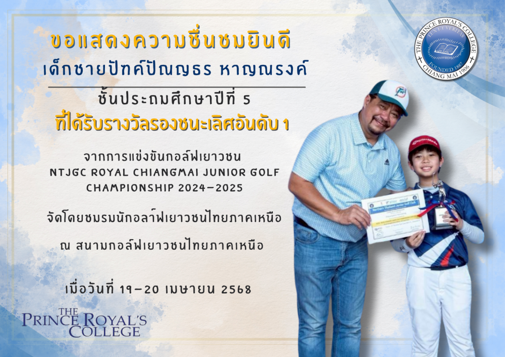 เด็กชาย ปัฑค์ปัณญธร หาญณรงค์ นักเรียนชั้นประถมศึกษาปีที่ 5 ที่ได้รับรางวัลรองชนะเลิศอันดับ1 ระดับภูมิภาค รุ่น Boy-C Division2 จากการแข่งขันกอล์ฟเยาวชน NTJGC Royal Chiangmai Junior Golf Championship 2024-2025