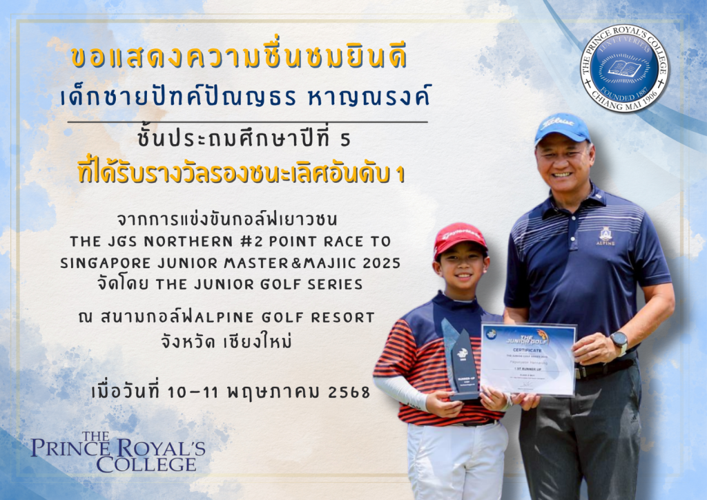 เด็กชายปัฑค์ปัณญธร หาญณรงค์ นักเรียนชั้นประถมศึกษาปีที่ 5 ที่ได้รับรางวัลรองชนะเลิศอันดับ1 ระดับภูมิภาค รุ่น Boy-D จากการแข่งขันกอล์ฟเยาวชน The JGS Northern #2 Point Race to Singapore Junior Master & MAJIIC 2025