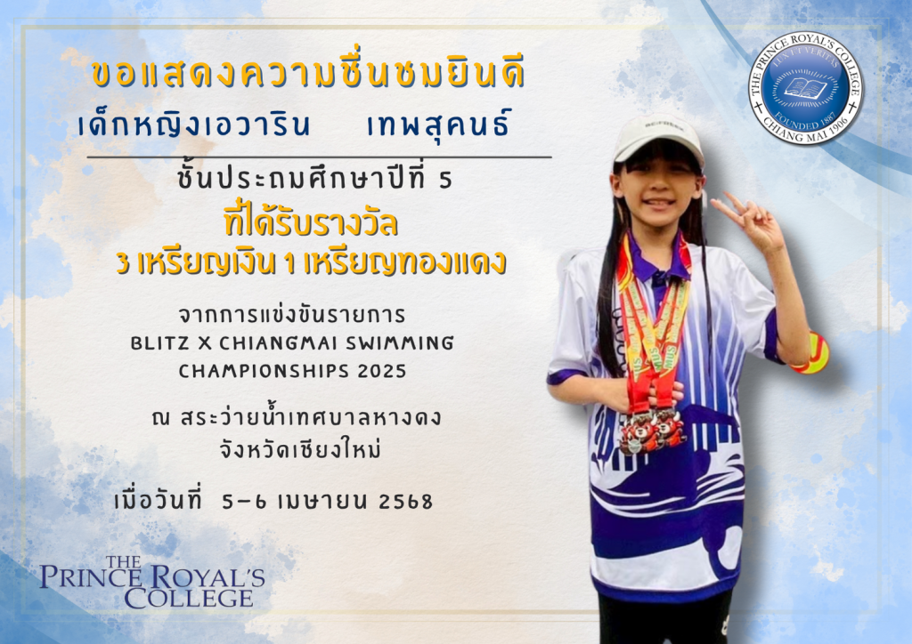 เด็กหญิงเอวาริน เทพสุคนธ์ นักเรียนระดับชั้นประถมศึกษาปีที่ 5 ที่ได้รับรางวัล 3เหรียญเงิน 1เหรียญทองแดง จากการแข่งขันรายการ BLITZ X CHIANGMAI Swimming Championships 2025 ระดับภูมิภาค