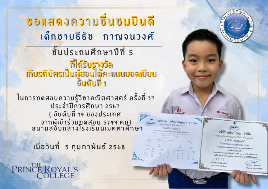 เด็กชายธีธัช กาญจนวงศ์ นักเรียนชั้นประถมศึกษาปีที่ 5 ที่ได้รับรางวัล เกียรติบัตรเป็นผู้สอบได้คะแนนยอดเยียม อันดับที่ 1 ของจังหวัดเชียงใหม่ ระดับชั้นประถมศึกษาปีที่ 4 ในการทดสอบความรู้วิชาคณิตศาสตร์ ครั้งที่ 37 ประจำปีการศึกษา 2567