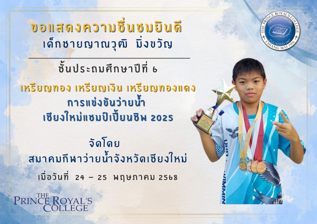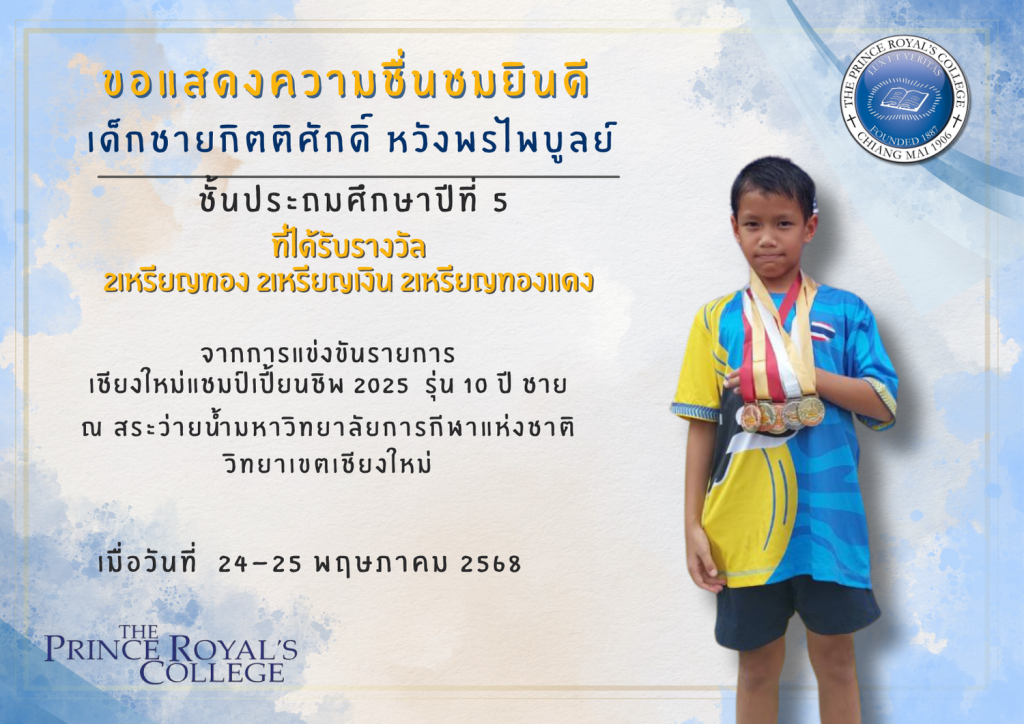 เด็กชายกิตติศักดิ์ หวังพรไพบูลย์ นักเรียนชั้นประถมศึกษาปีที่ 5 ที่ได้รับรางวัล 2 เหรียญทอง 2 เหรียญเงิน 2เหรียญทองแดง รายการเชียงใหม่แชมเปี้ยนชิพ 2025 ระดับ จังหวัด จัดโดย CNX Swimming