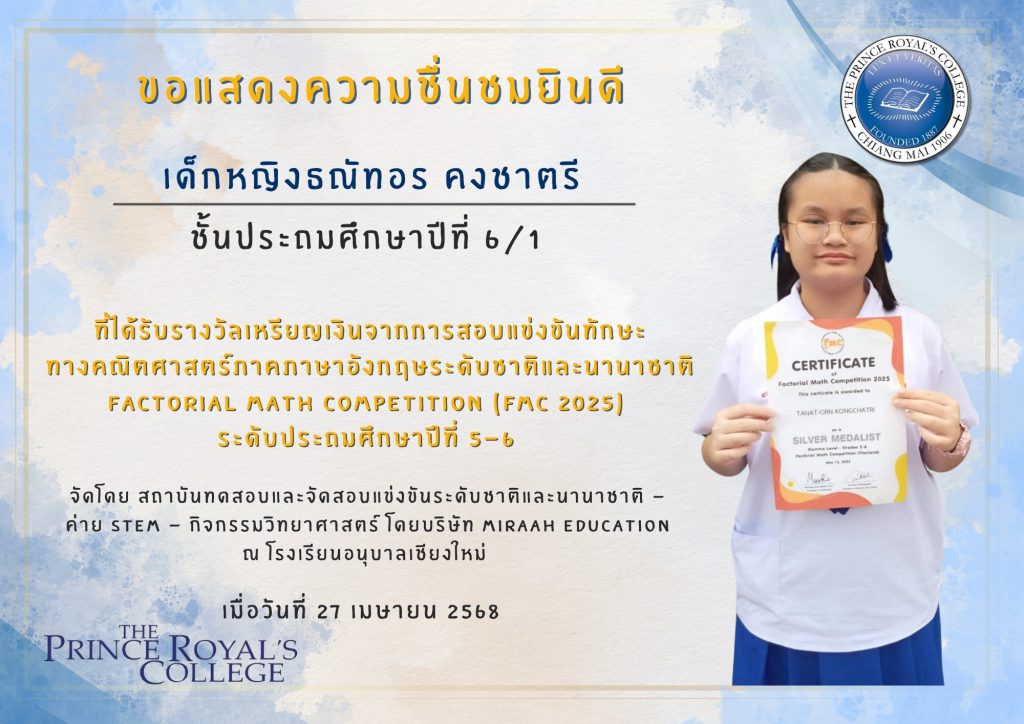เด็กหญิงธณัทอร คงชาตรี นักเรียนระดับชั้นประถมศึกษาปีที่ 6/1 รางวัลเหรียญเงินจากการสอบแข่งขันทักษะทางคณิตศาสตร์ภาคภาษาอังกฤษระดับชาติและนานาชาติ Factorial Math Competition (FMC 2025) ระดับประถมศึกษาปีที่ 5-6