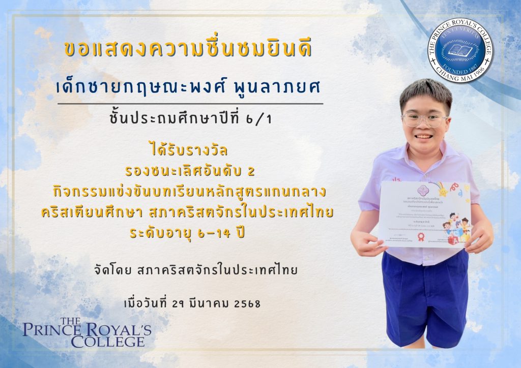 เด็กชายกฤษณะพงศ์ พูนลาภยศ นักเรียนระดับชั้นประถมศึกษาปีที่ 6/1 รางวัลรองชนะเลิศอันดับ 2 กิจกรรมแข่งขันบทเรียนหลักสูตรแกนกลางคริสเตียนศึกษา สภาคริสตจักรในประเทศไทย ระดับอายุ 6-14 ปี