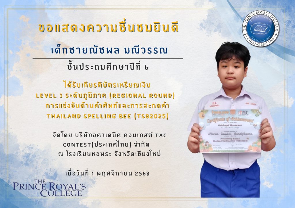เด็กชายณัชพล มณีวรรณ เกียรติบัตรเหรียญเงิน Level 3 ระดับภูมิภาค (regional round) การแข่งขันด้านคำศัพท์และการสะกดคำ Thailand Spelling Bee (TSB2025)