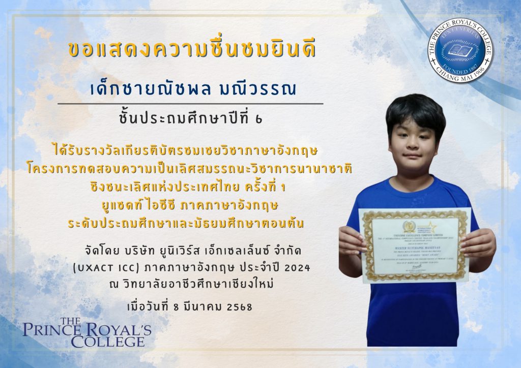 เด็กชายณัชพล มณีวรรณ รางวัลเกียรติบัตรชมเชยวิชาภาษาอังกฤษ โครงการทดสอบความเป็นเลิศสมรรถนะวิชาการนานาชาติ ชิงชนะเลิศแห่งประเทศไทย ครั้งที่ 1