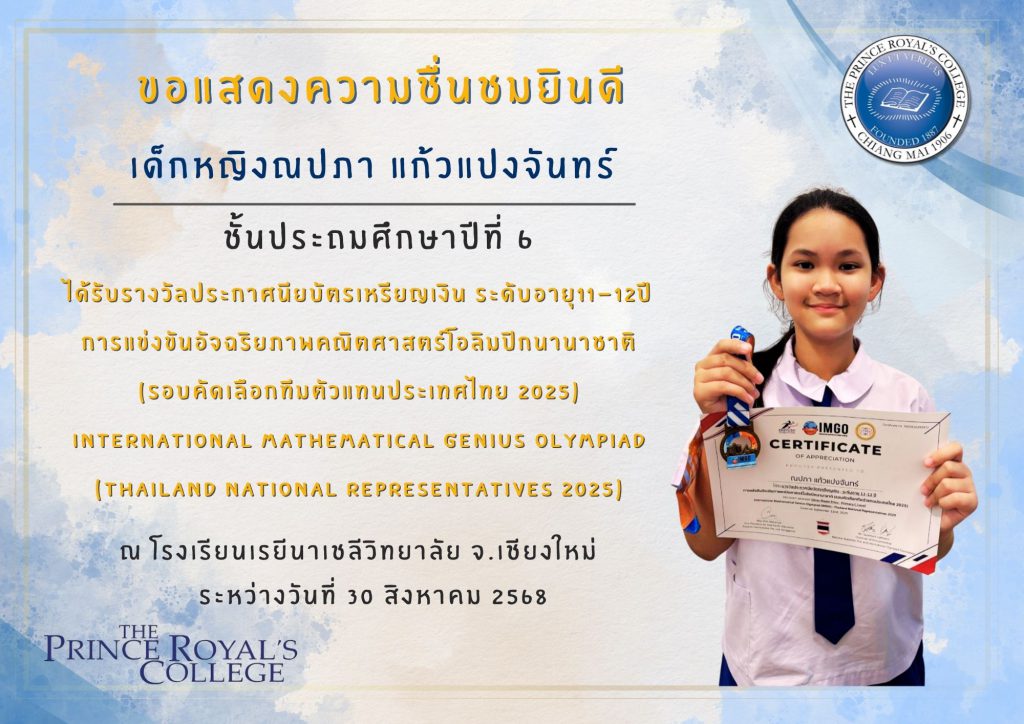 การแข่งขันอัจฉริยภาพคณิตศาสตร์โอลิมปิกนานาชาติ (รอบคัดเลือกทีมตัวแทนประเทศไทย 2025) เด็กหญิงณปภา แก้วแปงจันทร์