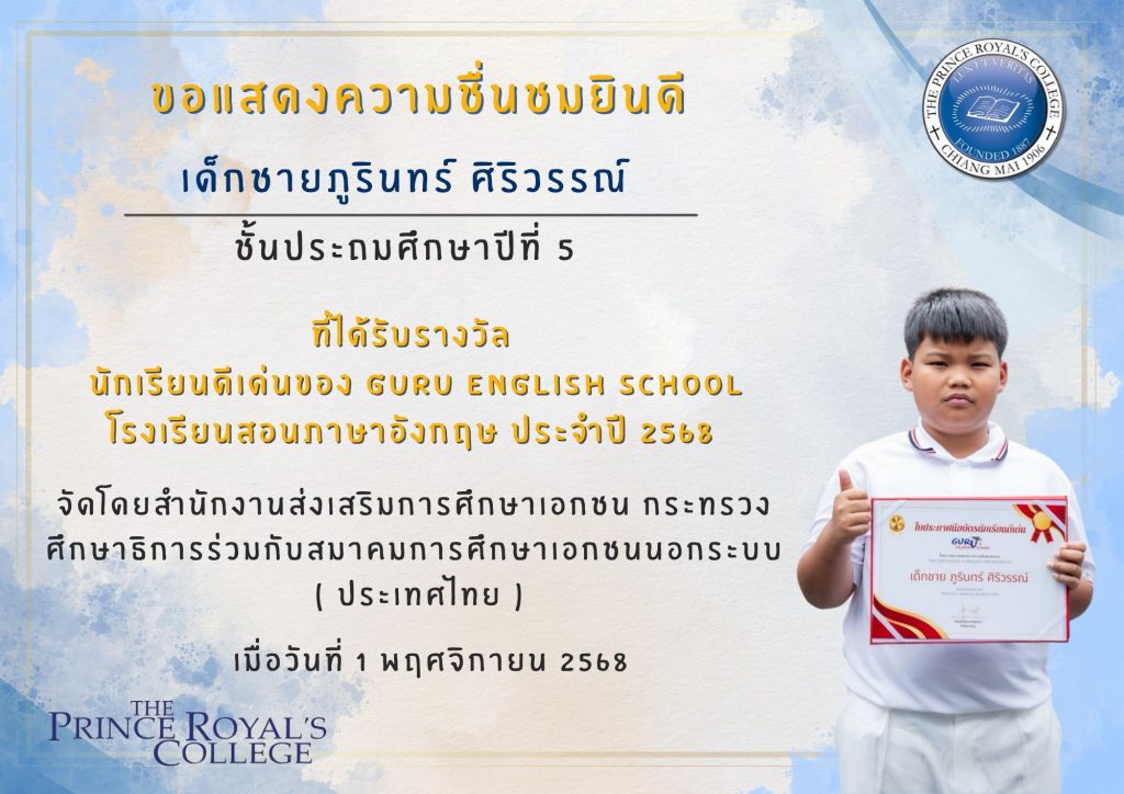 เด็กชายภูรินทร์ ศิริวรรณ์ นักเรียนระดับชั้นประถมศึกษาปีที่ 5 ได้รับรางวัล นักเรียนดีเด่นของ Guru English School