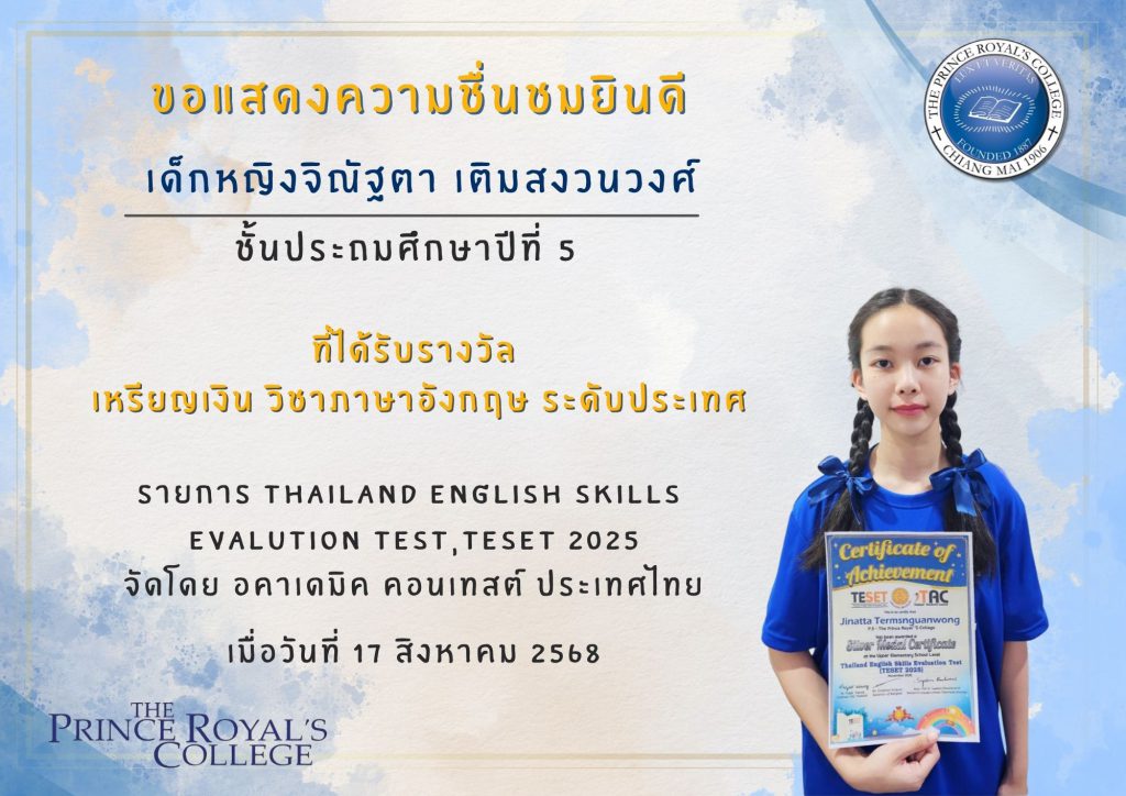 เด็กชายวิภาส มรกตวิจิตรการ รางวัลเหรียญเงิน ระดับประเทศ Thailand English Skills Evaluation Test (TESET 2025)