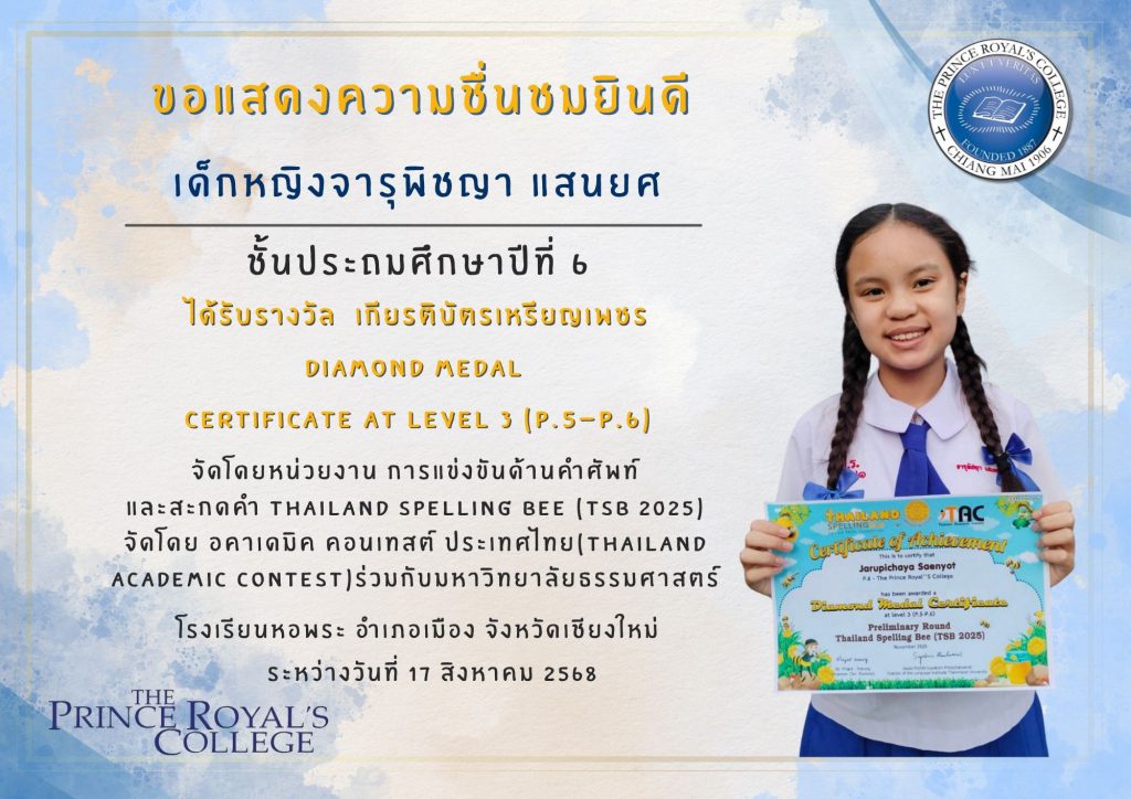 เกียรติบัตรเหรียญเพชรDiamond Medal Certificate at level 3 เด็กหญิงจารุพิชญา แสนยศ