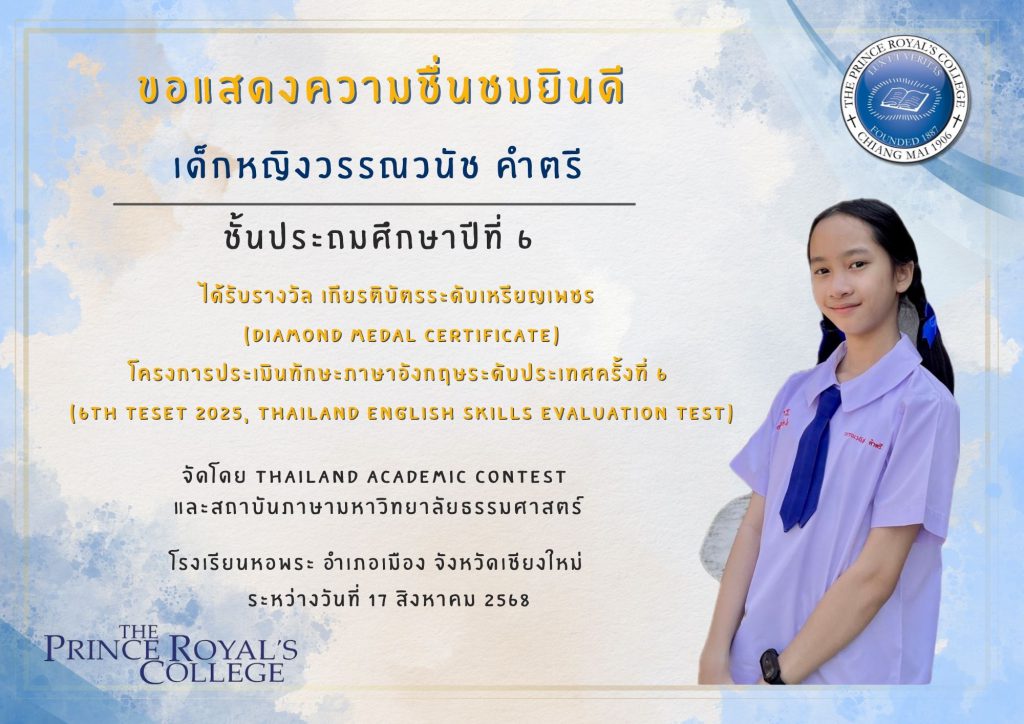เกียรติบัตรระดับเหรียญเพชร การแข่งขันโครงการประเมินทักษะภาษาอังกฤษระดับประเทศครั้งที่ 6 เด็กหญิงวรรณวนัช คำตรี