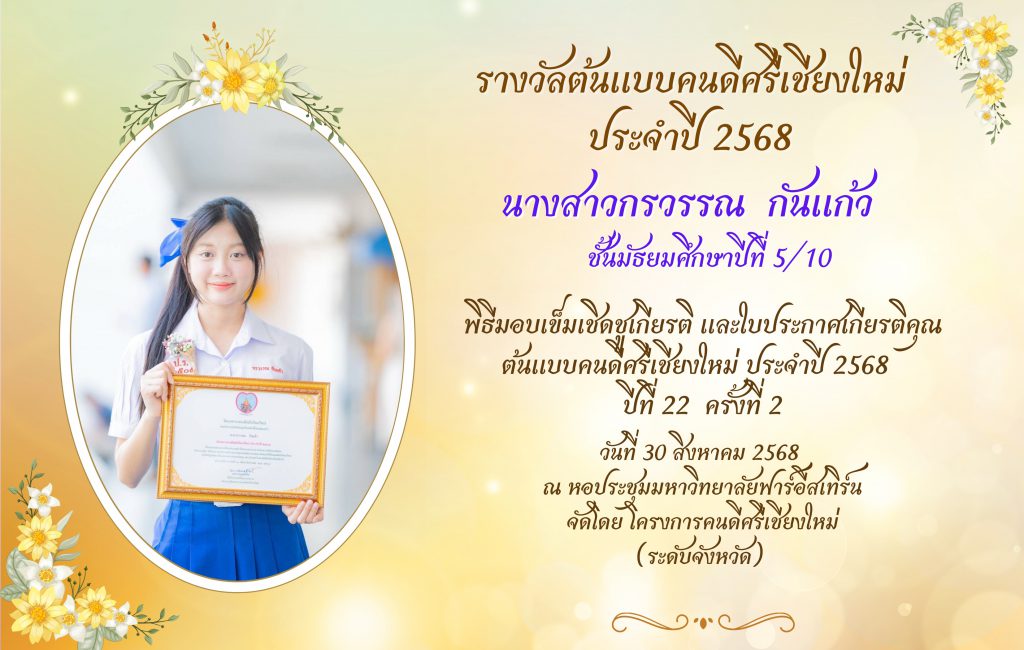 นางสาวกรวรรณ กันแก้ว รับใบประกาศเกียรติคุณต้นแบบคนดีศรีเชียงใหม่ ประจำปี 2568