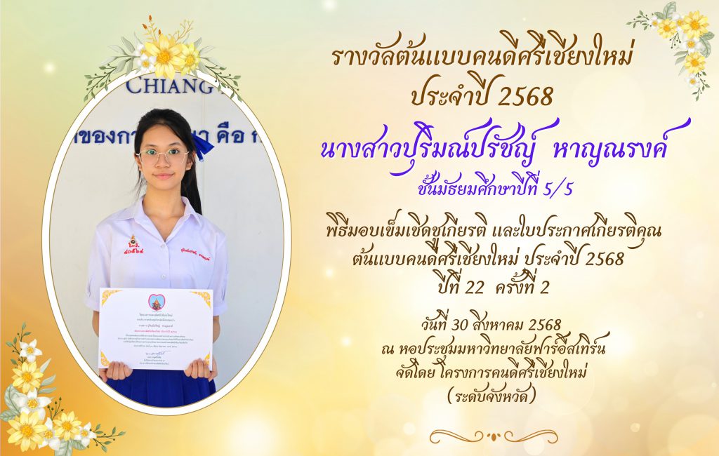 นางสาวปุริมณ์ปรัชญ์ หาญณรงค์ รับใบประกาศเกียรติคุณต้นแบบคนดีศรีเชียงใหม่ ประจำปี 2568