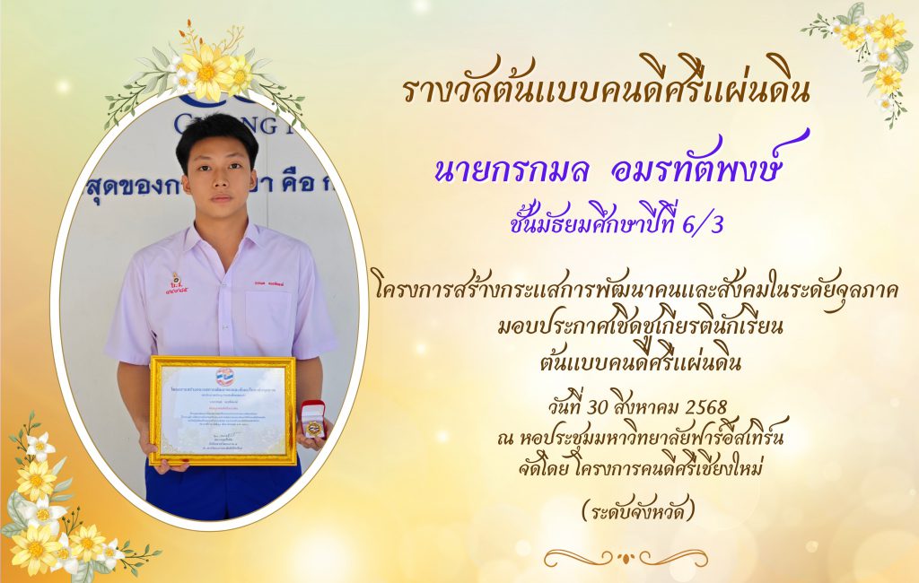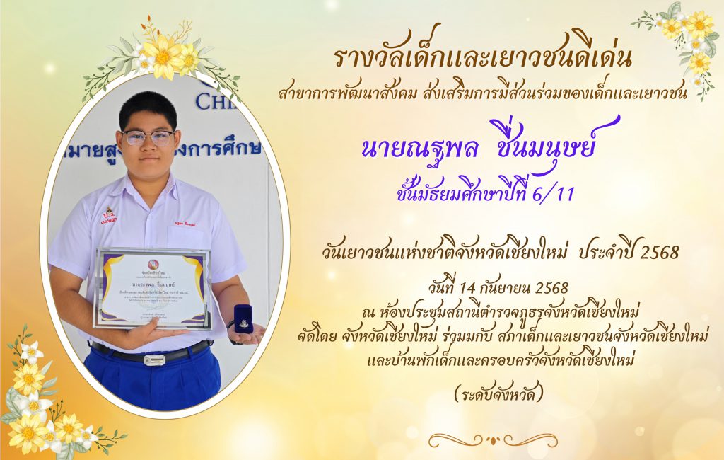 นายณฐพล ชื่นมนุษย์ ได้รับคัดเลือกให้เป็นเด็กและเยาวชนดีเด่นจังหวัดเชียงใหม่ ประจำปี 2568