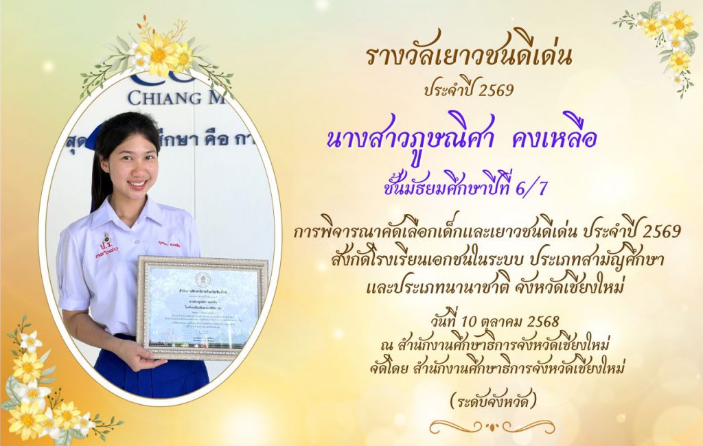 นางสาวภูษณิศา คงเหลือ รับเกียรติบัตรเยาวชนดีเด่น