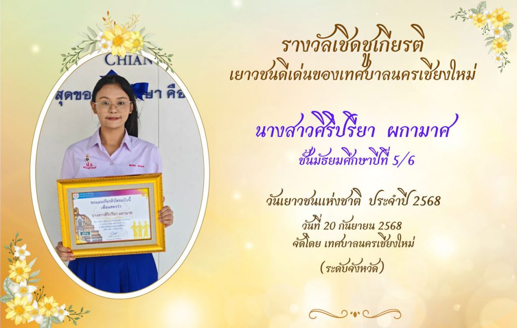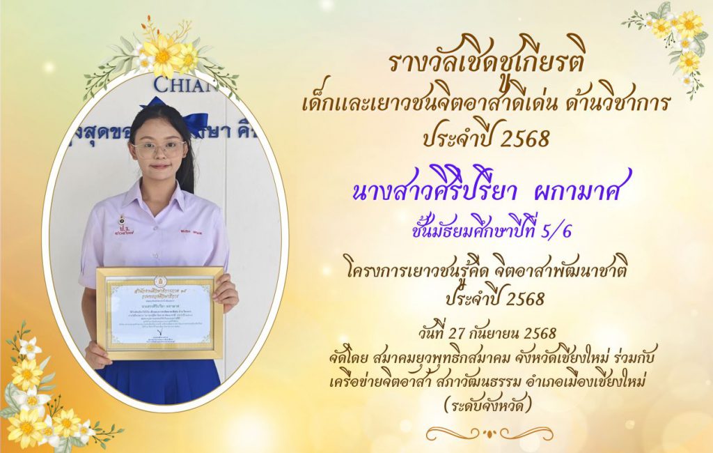 นางสาวศิริปรียา ผกามาศ รับเกียรติบัตรเด็กและเยาวชนจิตอาสาดีเด่น ด้านวิชาการ