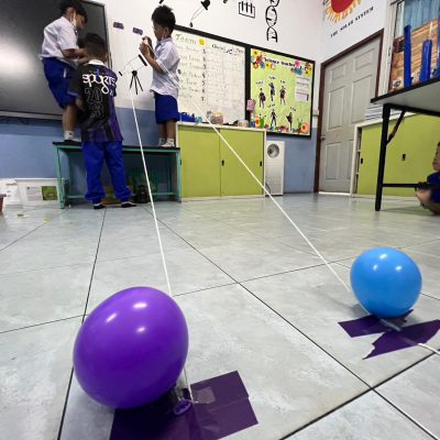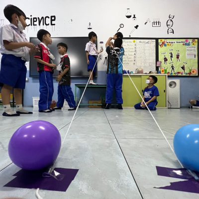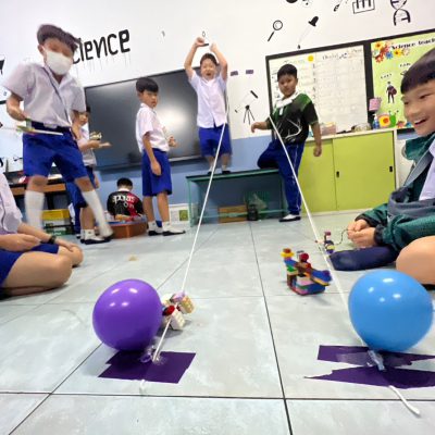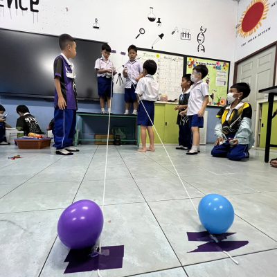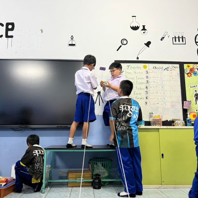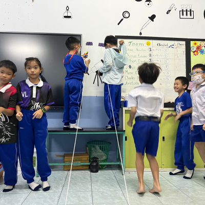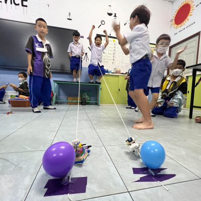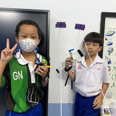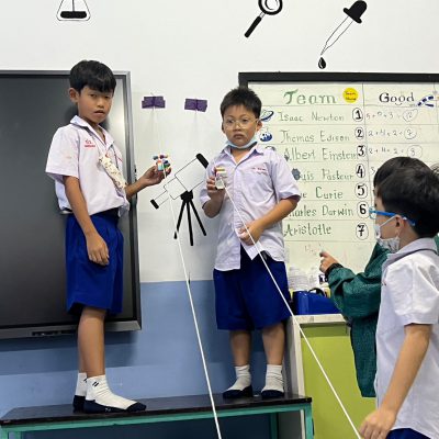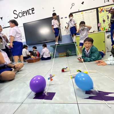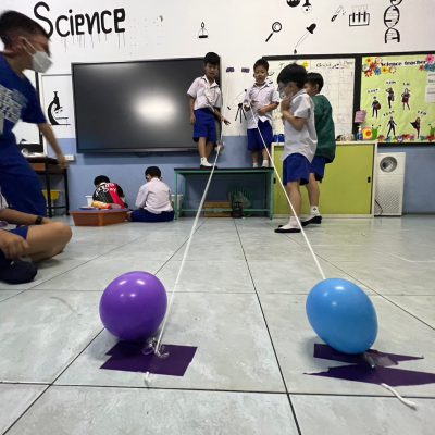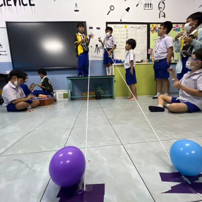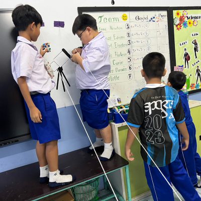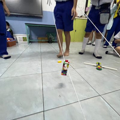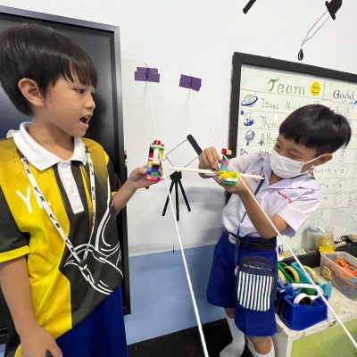 นักเรียนออกแบบ Zip Line และทดสอบการเคลื่อนที่ โดยใช้หลักการทางวิทยาศาสตร์เรื่องการเคลื่อนที่และแรงเสียดทานในการแก้ปัญหา มีการวางแผนและออกแบบเป็นทีม