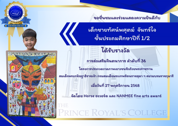 เด็กชายทัศน์พศุตม์ จันทร์ใจ ชั้นประถมศึกษาปีที่ 1/2 ได้รับรางวัลการส่งเสริมจินตนาการ ลำดับที่ 36 โครงการประกวดวาดภาพเยาวชนชิงถ้วยพระราชทาน สมเด็จพระกนิษฐาธิราชเจ้า กรมสมเด็จพระเทพรัตนราชสุดา ฯ สยามบรมราชกุมารี