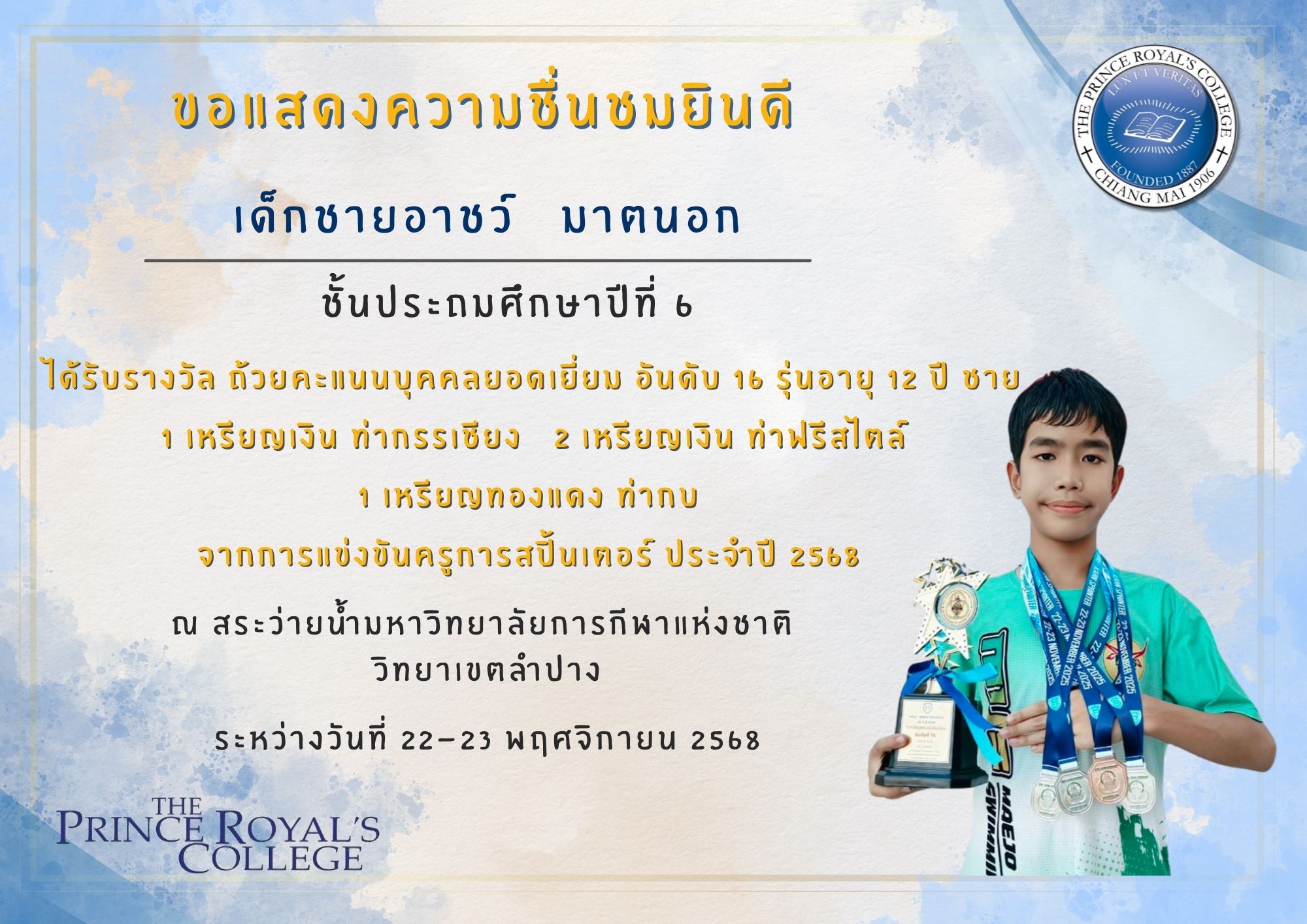 ขอแสดงความชื่นชมยินดีกับเด็กชายอาชว์  มาตนอก นักเรียนชั้นประถมศึกษาปีที่ 6/3
