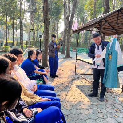 นักเรียนระดับชั้นมัธยมศึกษาปีที่ 4 และ 5 ห้องเรียนปกติ เข้าร่วมกิจกรรมวิชาเลือกเสรี Make your passion happen ภาษาเกาหลี : ในปัจจุบันการเรียนรู้ภาษาที่ 3 เป็นสิ่งจำเป็นสำหรับนักเรียน และภาษาเกาหลีเป็นภาษาหนึ่งที่นักเรียนให้ความสนใจเลือกเรียน นอกจากเรียนรู้การใช้ภาษาในห้องเรียนแล้ว การเรียนรู้วัฒนธรรมของเจ้าของภาษาก็มีความจำเป็นอย่างยิ่ง ดังนั้นเมื่อวันที่ 15 กุมภาพันธ์ 2566 จึงนำนักเรียนเข้าไปเรียนรู้วัฒนธรรมเกาหลีผ่านกิจกรรมการแต่งกาย การละเล่น และทำอาหาร ณ สวนทวีชลเชียงใหม่ นักเรียนได้รับประสบการณ์ตรง และสามารถนำประสบการณ์ที่ได้รับไปประกอบการตัดสินใจเลือกศึกษาต่อในระดับอุดมศึกษาต่อไป