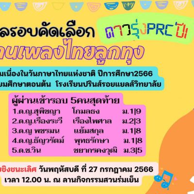 มีนักเรียนเข้าร่วมการคัดเลือก 20 คนจากนักเรียนชั้นมัธยมศึกษาปีที่ 1-3 ผ่านเข้ารอบชิงชนะเลิศในวันพฤหัสบดีที่ 27 กรกฎาคม 2566 นี้ 5คน ณลานกิจกรรมสวนร่มเย็นตั้งแต่เวลา 12:00 น เป็นต้นไป