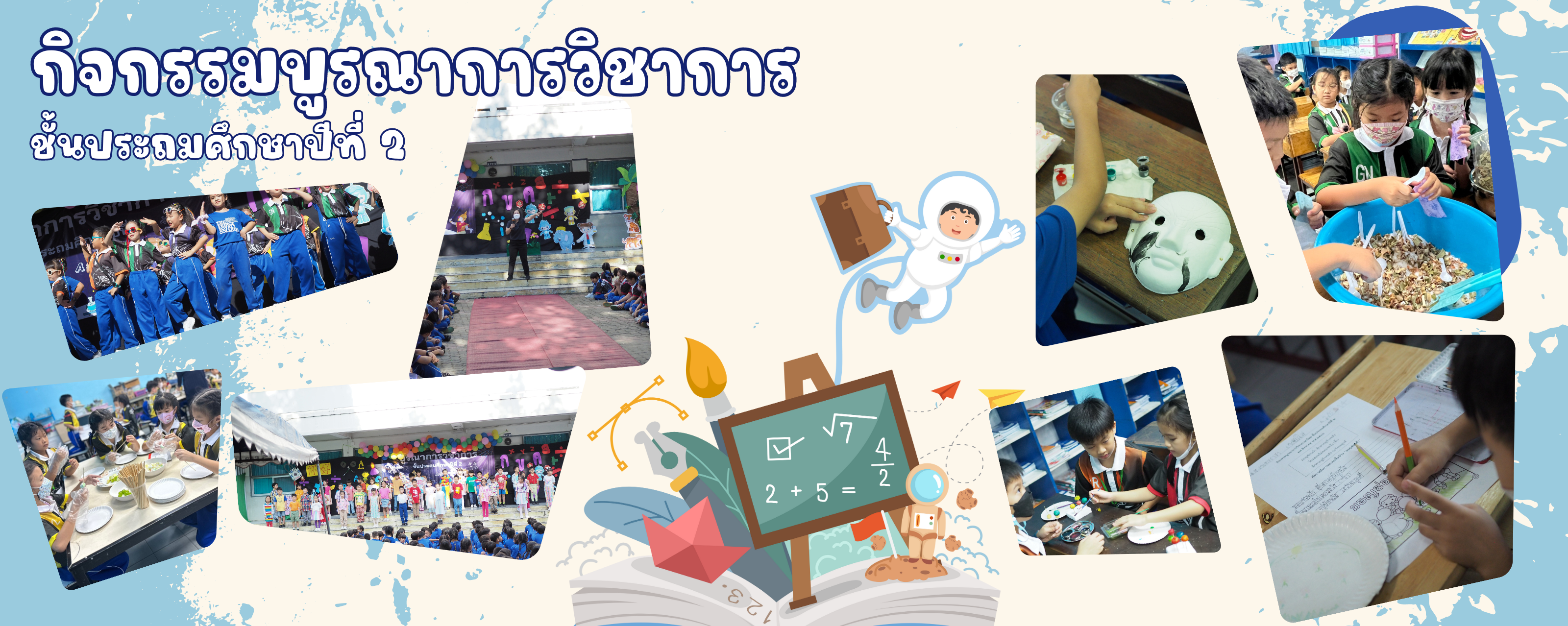 ระหว่างวันที่ 17-18 สิงหาคม 2566 ระดับชั้นประถมศึกษาปีที่ 2 จัดงานบูรณาการวิชาการ โดยมีวัตถุประสงค์เพื่อให้นักเรียนได้เรียนรู้ผ่านการลงมือปฏิบัติ จากกิจกรรมการเรียนรู้ที่หลากหลาย สามารถนำความรู้ไปใช้ในชีวิตประจำวันได้ ในงานมีกิจกรรมที่เปิดโอกาสให้นักเรียนได้แสดงความสามารถ เช่น การตอบคำถามชิงรางวัล การละเล่นพื้นบ้าน การระบายสีหน้ากาก การทำลูกชุบ การแข่งขันจรวดขวดน้ำ ฯลฯ