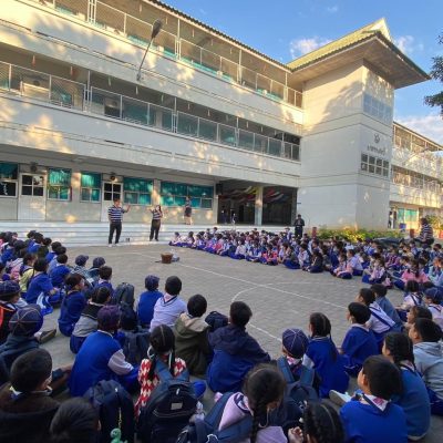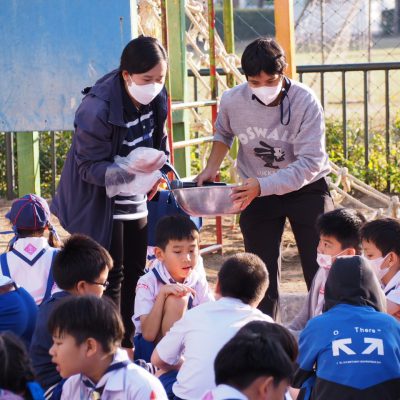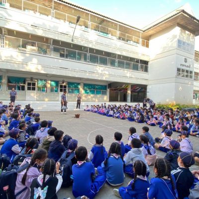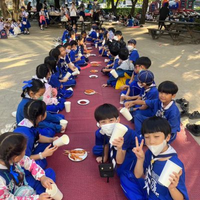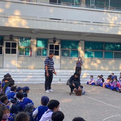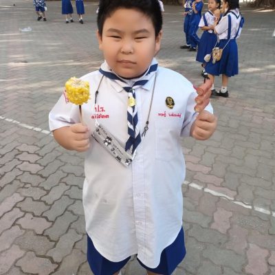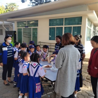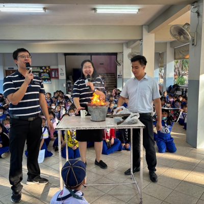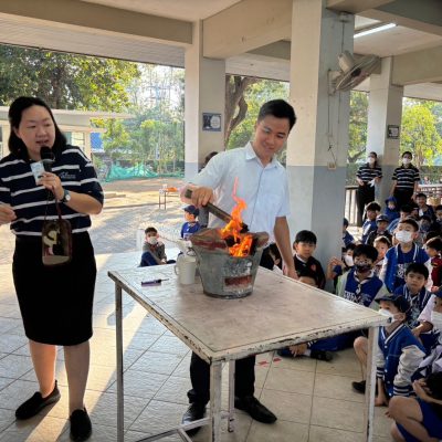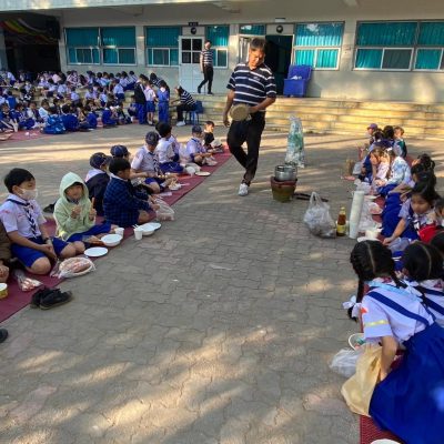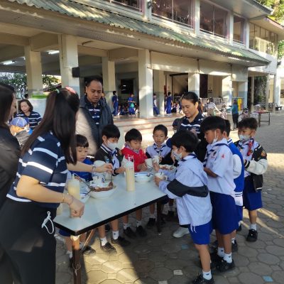 โดยนักเรียนชั้นประถมศึกษาปีที่ 1 สาธิตการก่อไฟด้วยเตา และ การทำโอวันติน
